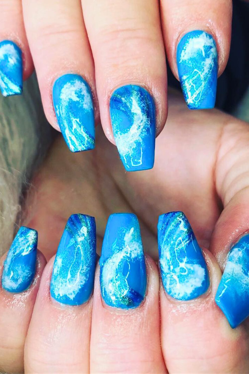 Calling all ocean lovers—this mani is like diving into crystal blue waves. With swirling patterns of aqua, navy, and soft white foam, these nails legit look like rolling surf. No palm trees or glitter here—just moody, powerful ocean vibes.
