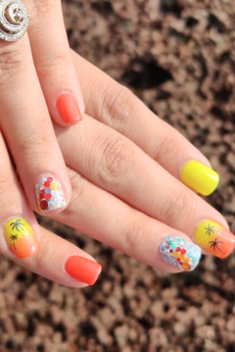 How cute is this playful mix?! From bright yellow and coral nails to sparkle-studded accents and tiny palm tree details—it’s giving vacation but with a crafty twist. The circle glitter nails add dimension and party energy, while the palms keep it grounded in beachy goodness.