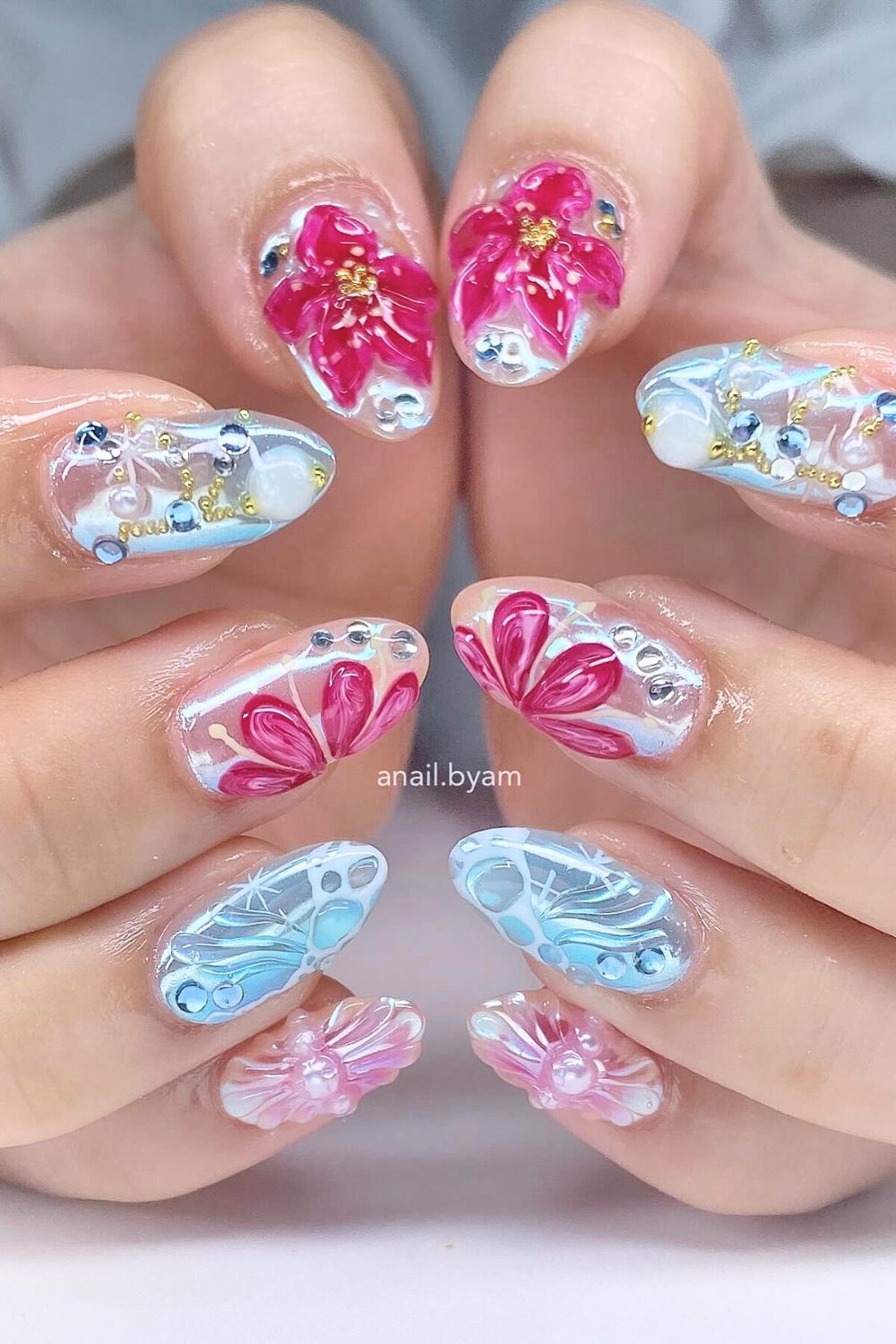 OMG, how dreamy is this one?! These long almond nails are pure mermaid fantasy. With cool ocean blues, pearly whites, and transparent jelly textures, it’s like dipping your fingers into the sea. The designs are giving seashells, coral reefs, and delicate hibiscus blooms—complete with mini pearls and 3D bubbles that literally look like water droplets.
