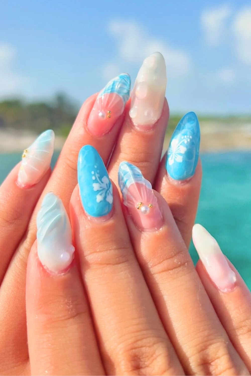 The floral accent is everything. It softens the shell energy and adds this sweet, romantic touch—perfect if you want your vacay nails to feel both elegant and fun. These would look amazing with a breezy white sundress and salty beach waves. Basically, it’s your nails but make it a beach fairytale.