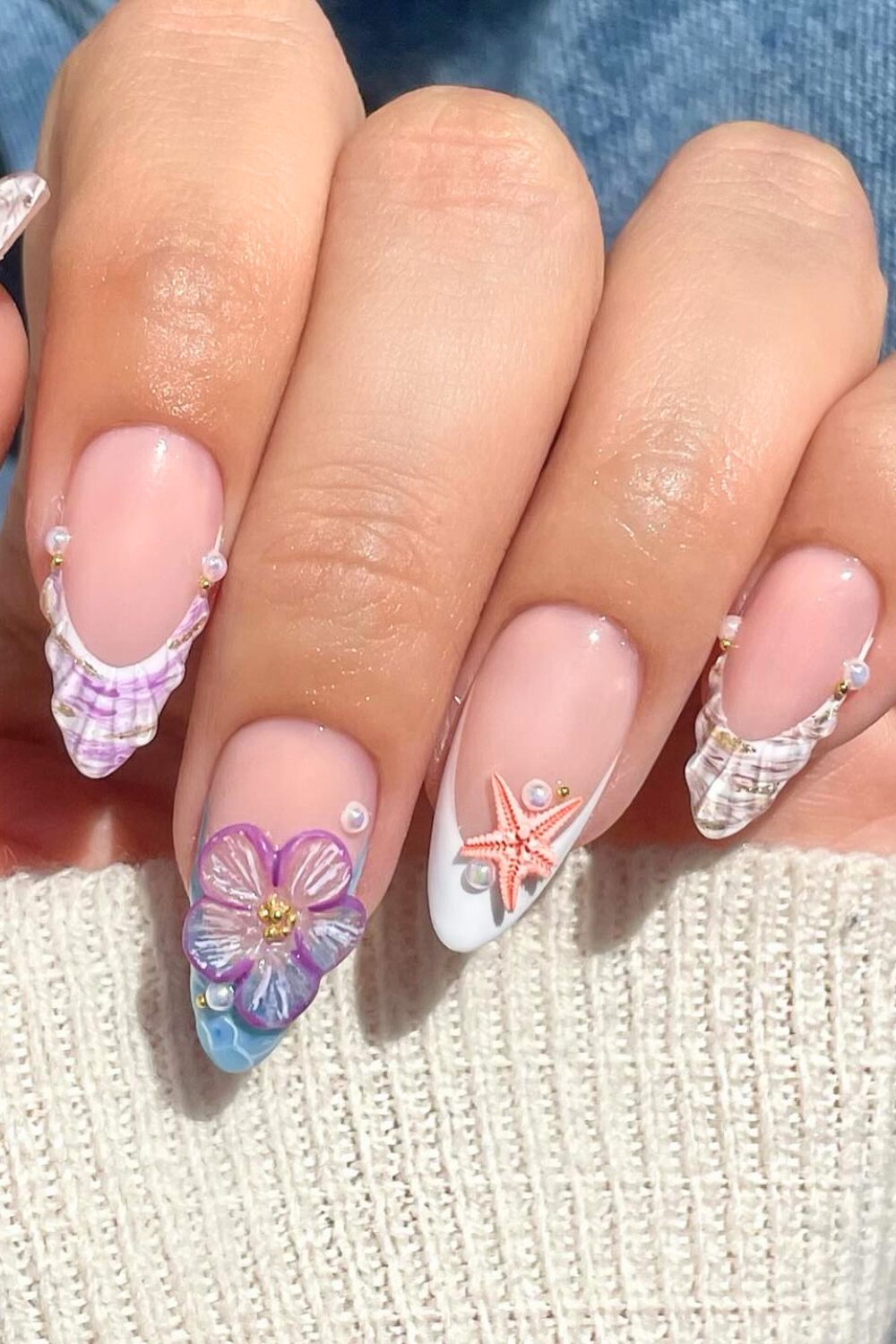 This one? Total seashell royalty. The translucent lilac shells, delicate pearls, and that 3D starfish? It’s giving “I just stepped out of a beachside spa in Mykonos.” The soft nude base keeps it natural, while the sculpted details totally elevate the look—like wearable ocean treasures.