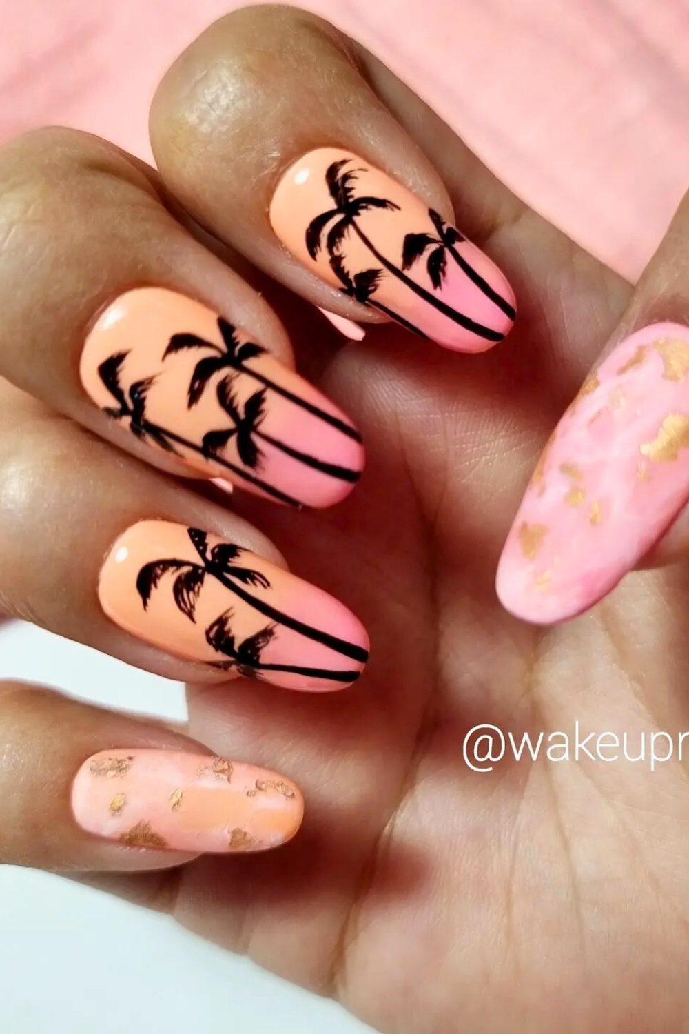 Here’s a unique twist on the sunset nails—a peachy ombré base meets chic black palm silhouettes. But the real plot twist? That soft pink marble nail with gold foil. It adds this luxe, feminine contrast that’s super cute and gives your mani that artsy-glam edge.