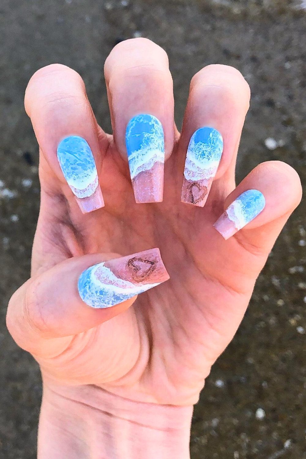 Okay, this one is literal beach goals. It’s like someone snapped a photo of the shoreline and printed it onto your nails—waves crashing, sand sparkling, and all. The sandy base is so textured and realistic, and the bright blue water detail? Chef’s kiss.
