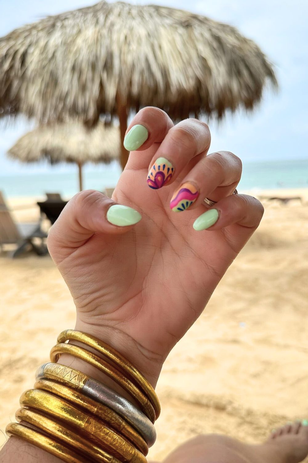 This look is perfect if you’re heading somewhere fun and festive—think beach festivals, pool parties, or just vibing on vacation with colorful beachwear. It’s upbeat, artsy, and def one of those “OMG, where’d you get your nails done?!” moments.