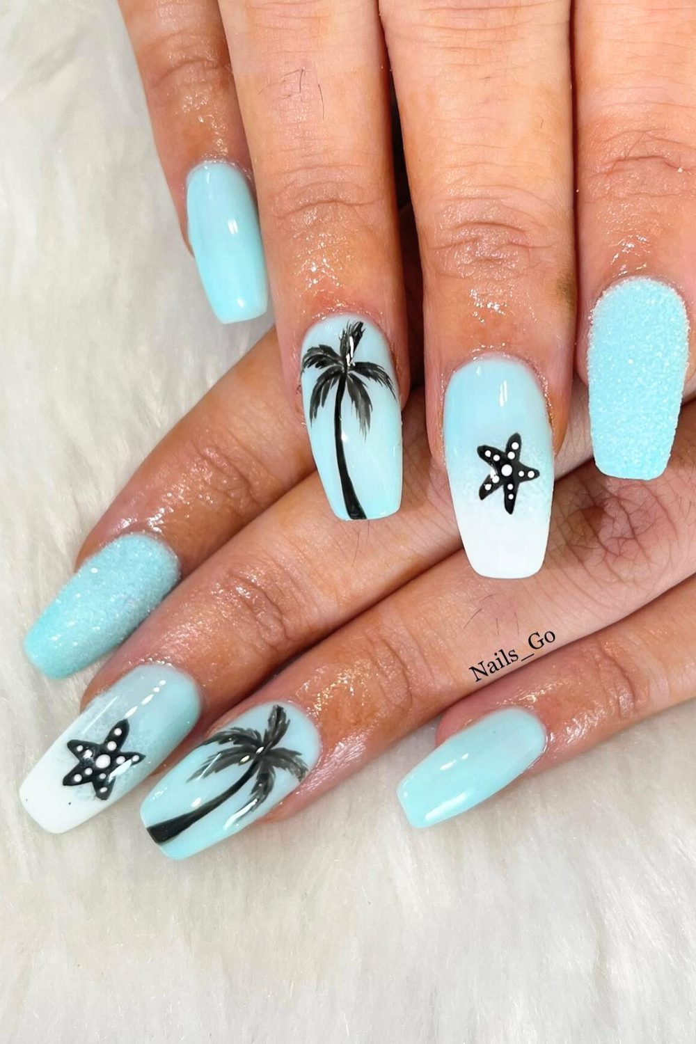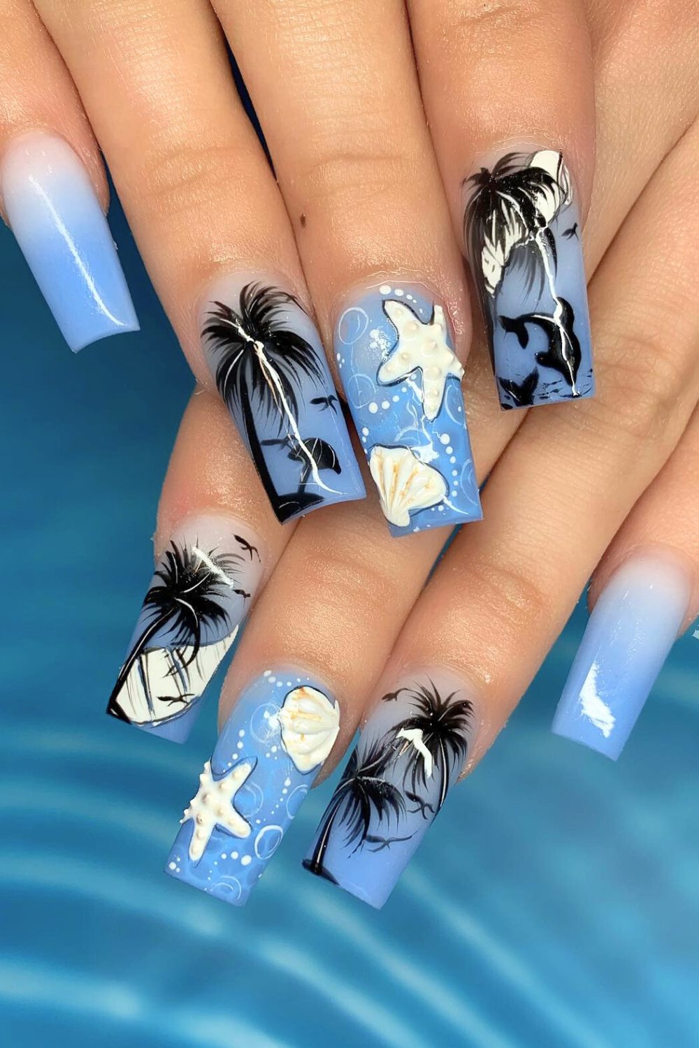 This soft blue palette is like a fresh splash of seafoam. The smooth gradient, paired with sugary-textured nails and dainty starfish accents, brings that “barefoot on the beach” vibe. And those tiny palm silhouettes? So simple, but so powerful.