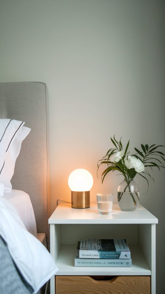 If you need storage, use a drawer or a small basket underneath. I store chargers and lip balm out of sight, and the surface stays calm and clutter-free. Visual simplicity creates mental calm, especially at night.