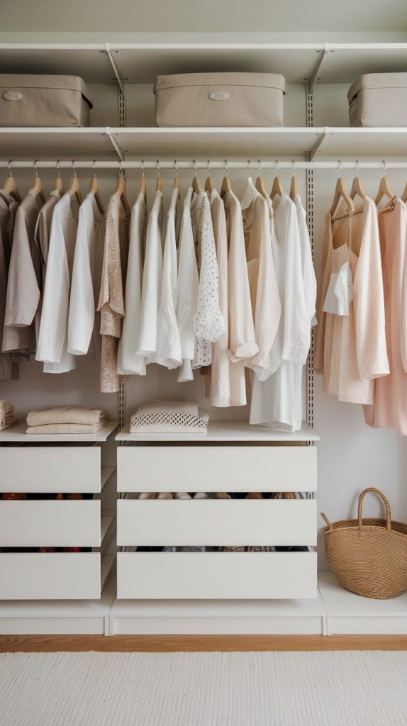 I organize my closet by category because it saves time and mental energy. You don’t need color-coded hangers or fancy systems. You need easy access and visual calm.