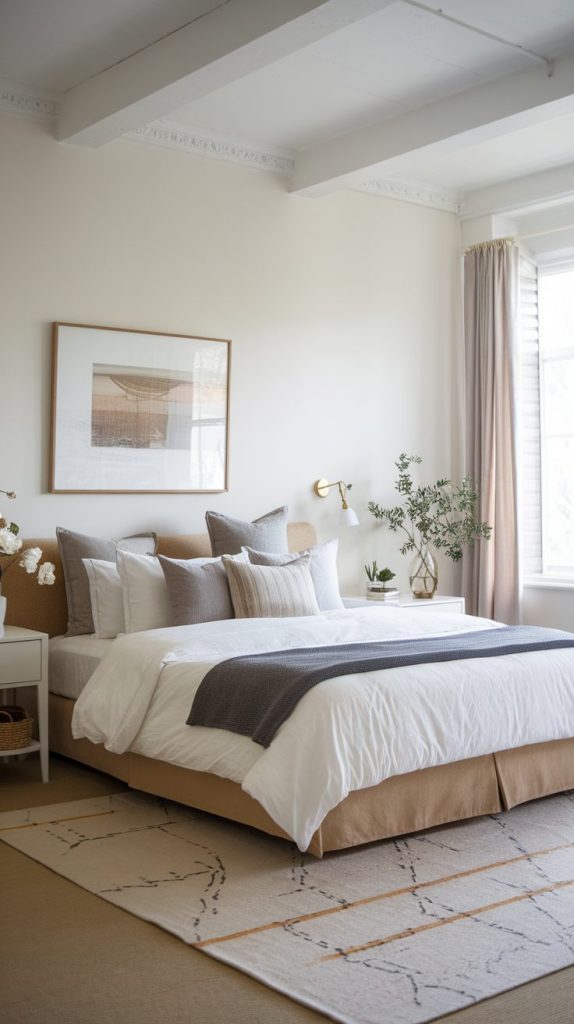 Neutral bases with soft accents create balance. Think warm whites, soft taupe, sage green, or dusty blue.