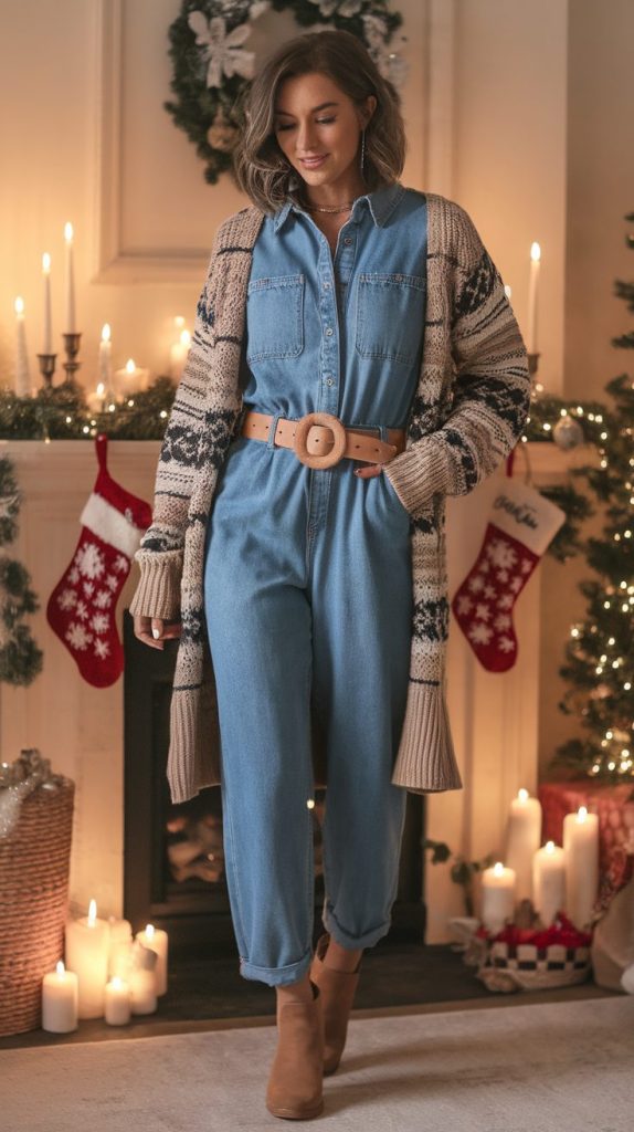 Go for a chunky knit sweater in a festive color—think forest green, deep burgundy, or soft cream. Pair it with dark-wash skinny or straight jeans, and finish with ankle boots or chic loafers. Add gold hoops or a sparkly hair clip, and suddenly your basic combo feels intentional.