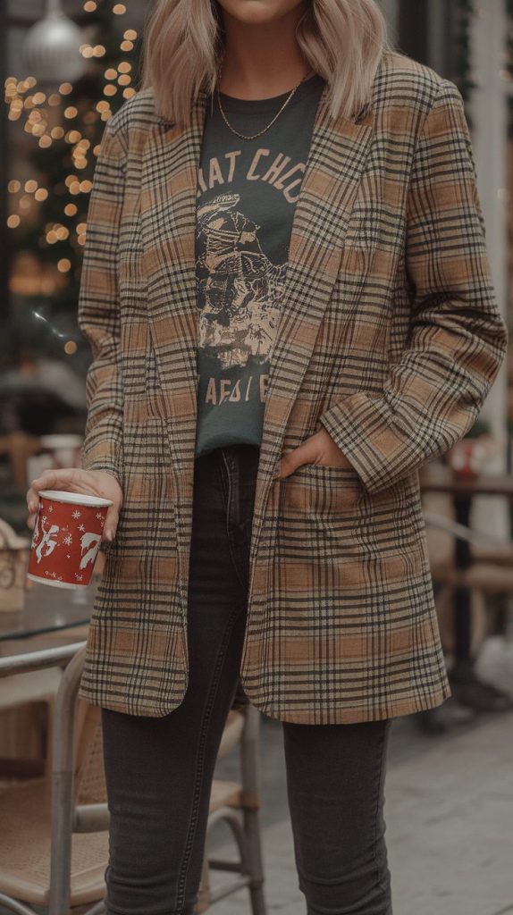 To give it a festive touch, pick a velvet or plaid blazer—something that nods to the season without screaming “Christmas sweater contest.”