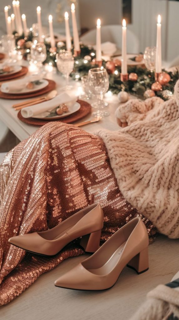 Pick a sequin skirt in gold, silver, or even rose gold, and keep everything else simple—minimal jewelry, natural makeup, maybe a red lip for a festive touch.