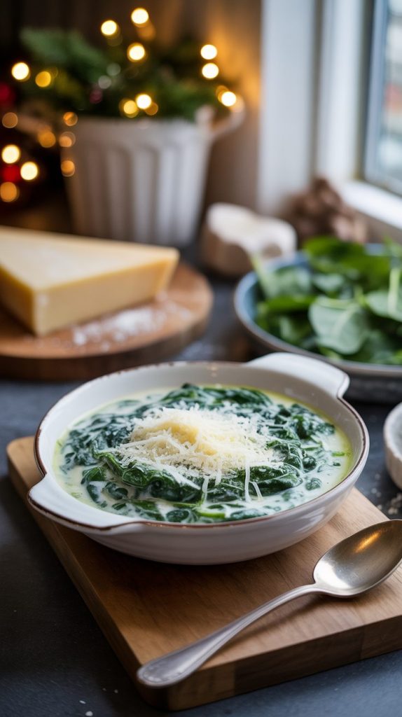 Sauté garlic in butter, stir in heavy cream and parmesan, then toss in fresh spinach until wilted. Add nutmeg for a subtle festive note.
