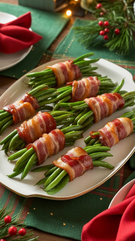 Wrap 5–6 beans in a strip of bacon, brush with brown sugar glaze, and bake until caramelized. Simple but elegant.