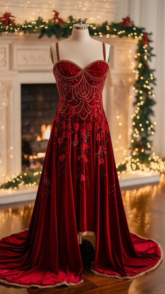 Ah, red velvet — the holiday MVP. It’s elegant, timeless, and impossible to ignore. You could wear this in 1995 or 2025, and still turn heads.