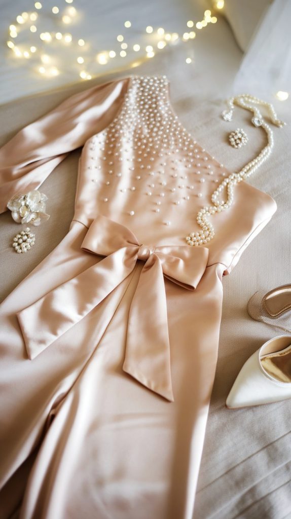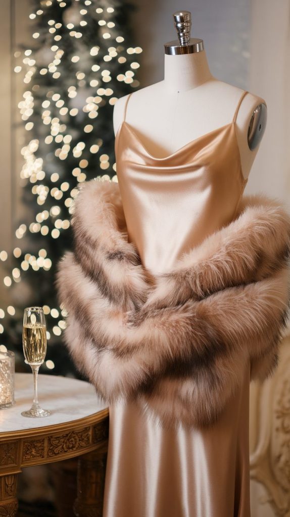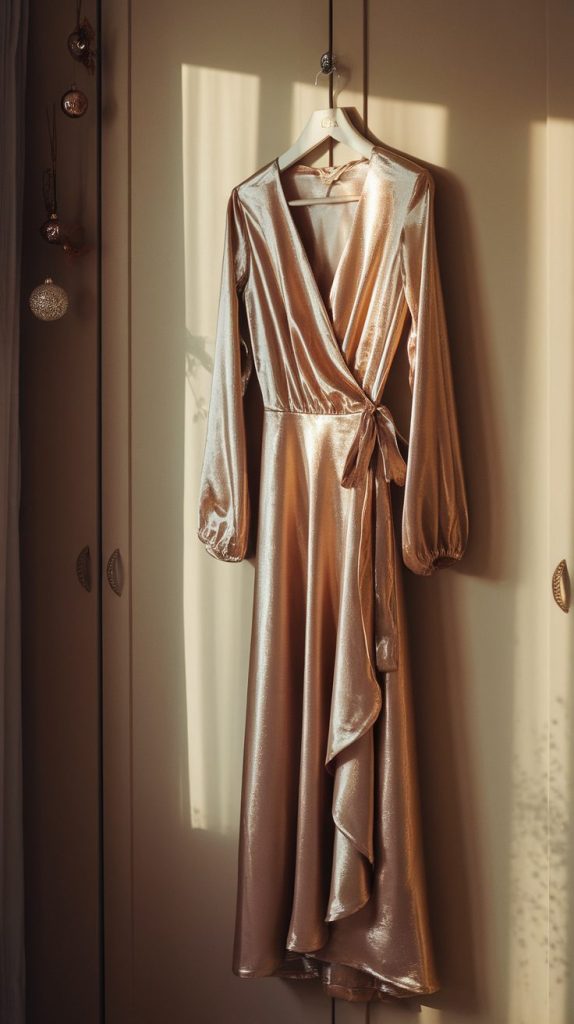 For those who love elegance with a side of Hollywood glam, this one’s for you. A satin slip dress in champagne, emerald, or deep plum feels effortlessly graceful.