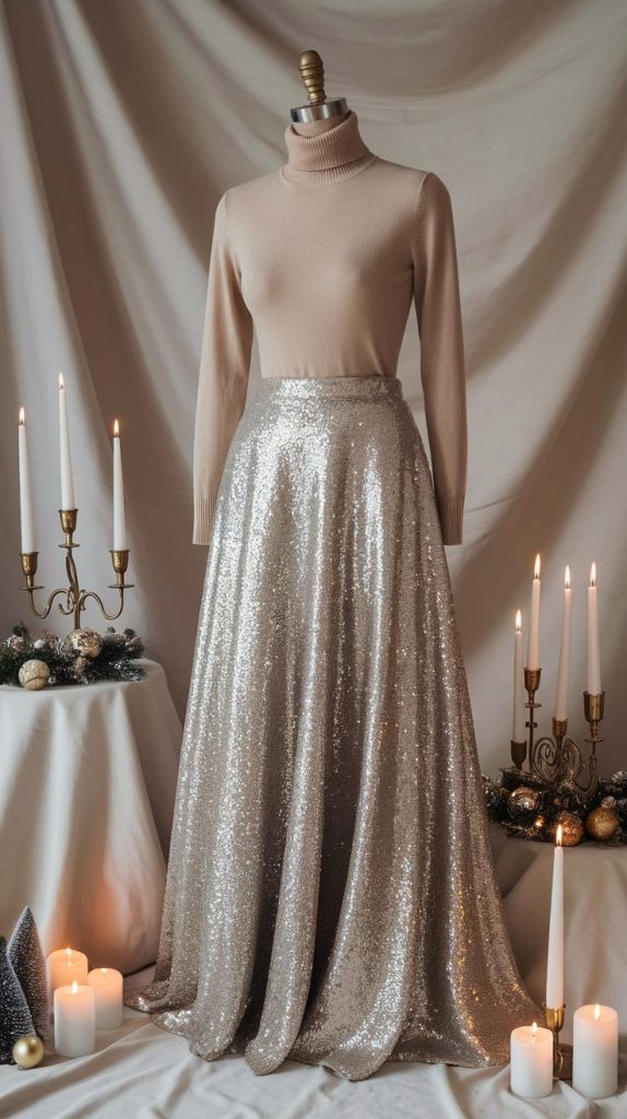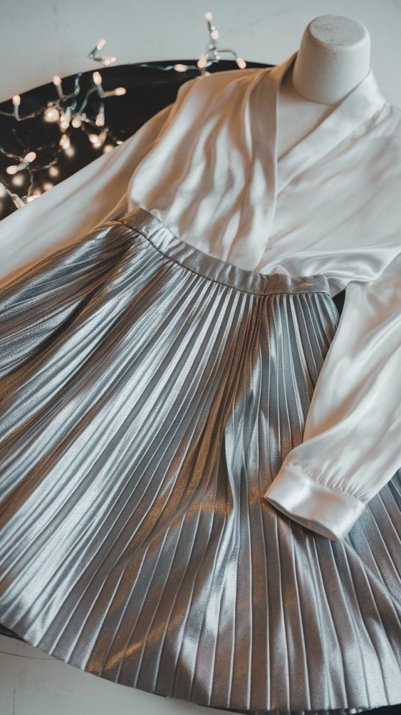 If dresses aren’t your thing, try mixing textures. A metallic pleated midi skirt paired with a silk blouse gives major holiday elegance with zero discomfort.