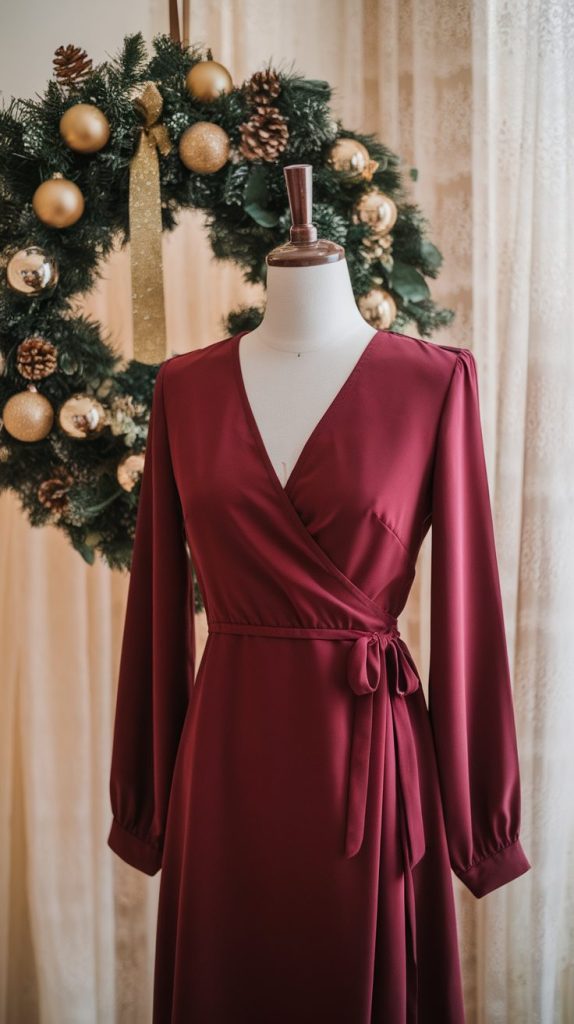 A burgundy wrap dress is elegant, universally flattering, and ideal for everything from family dinners to date nights.