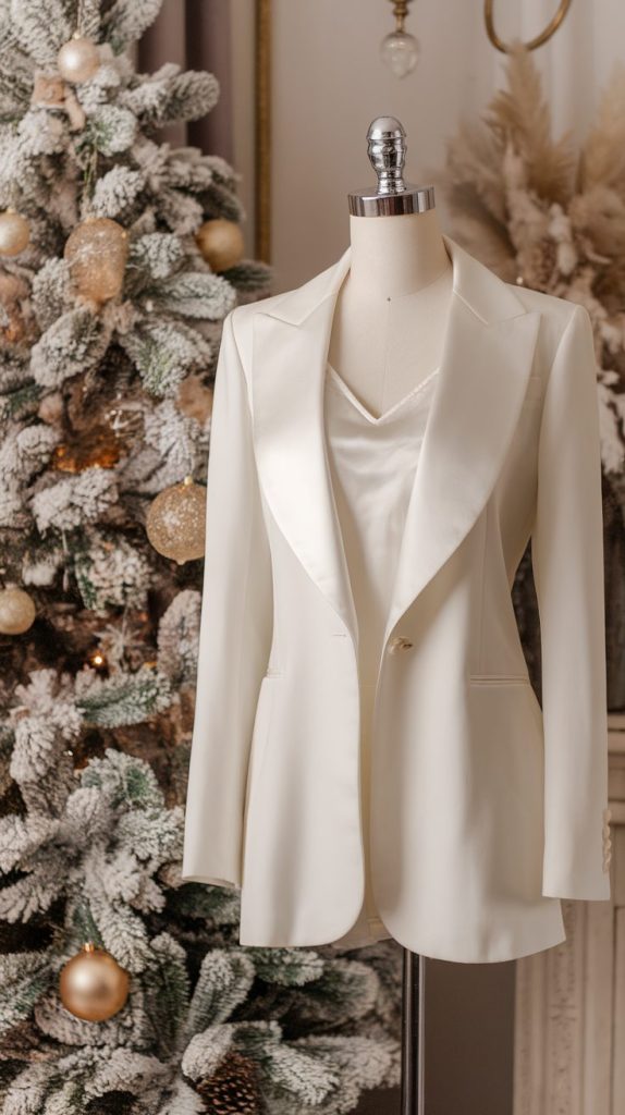 White for Christmas? Absolutely. A tailored white suit paired with a satin camisole underneath is modern, sharp, and unforgettable.