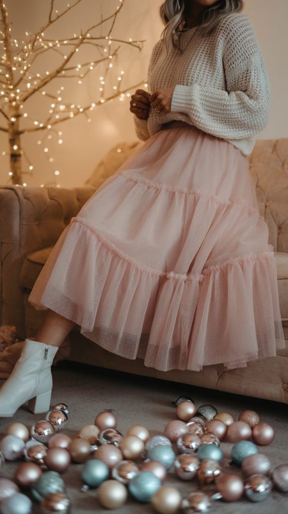 Add a delicate crystal headband or dainty necklace to elevate the charm. It’s giving balletcore meets Christmas chic.