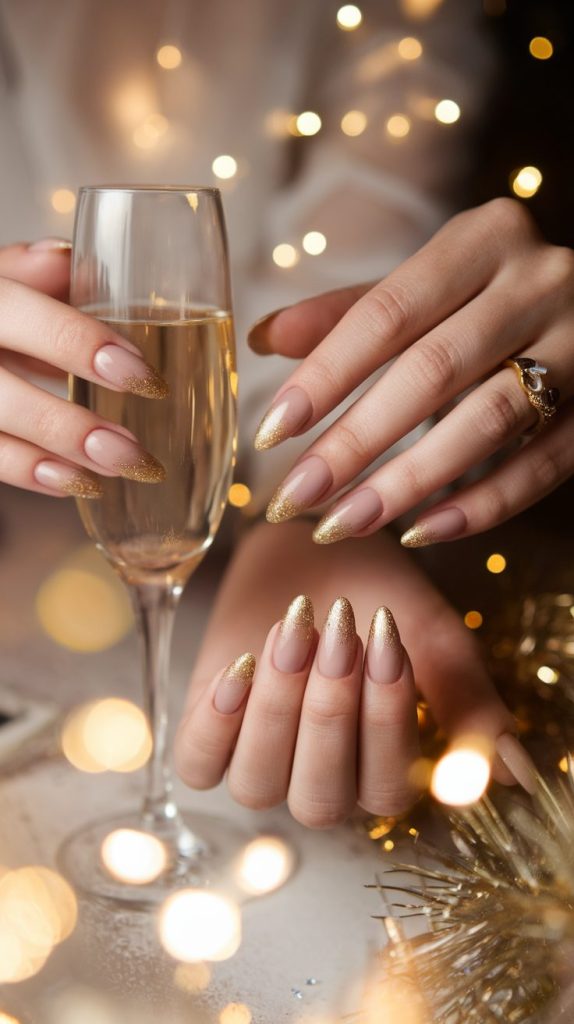 Champagne ombre nails transition from a soft beige base to a glittery gold or rose shimmer at the tips. It’s subtle enough for those who prefer neutral tones but still festive enough for the occasion.