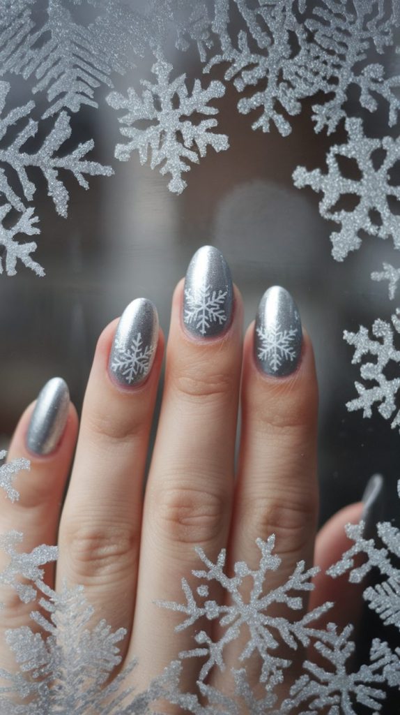 12. Icy Silver Snowflake Nails