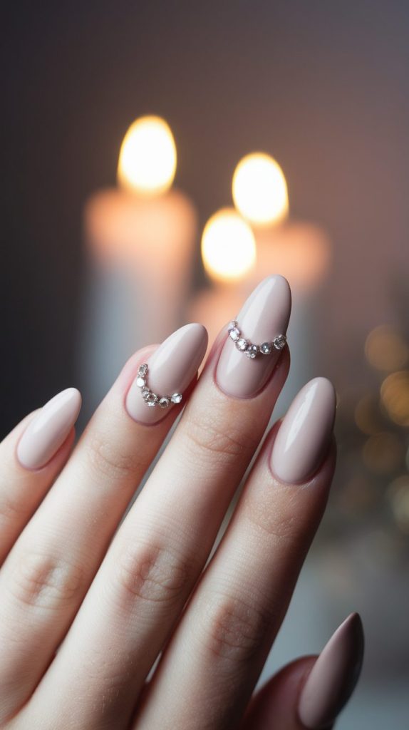 Go for a creamy beige or pink base and add a single rhinestone at the base or tip of each nail. The result is minimalist luxury that feels incredibly polished.