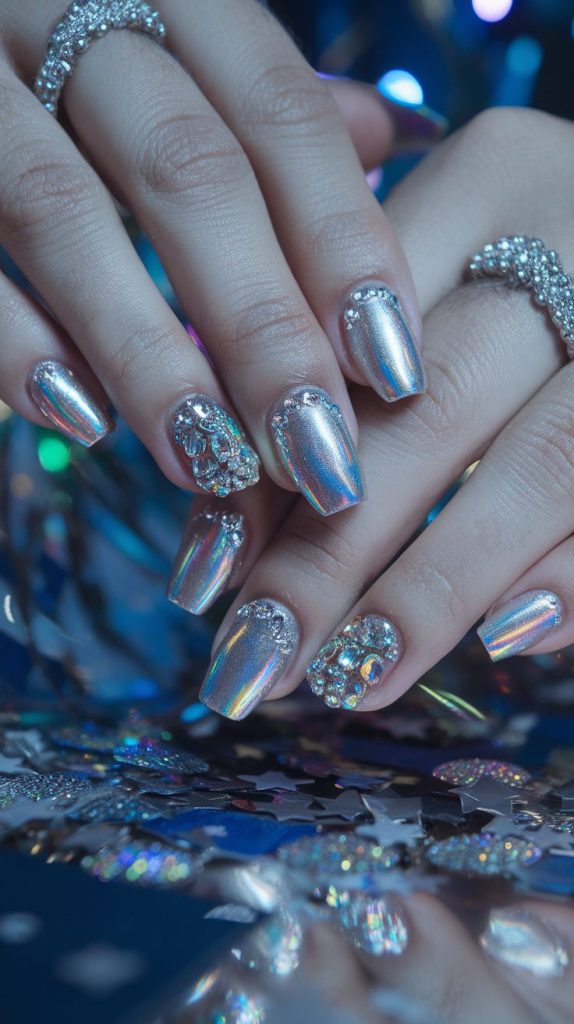 Let’s end with a showstopper — holographic silver nails. Because if there’s ever a night to go all out, it’s New Year’s Eve.