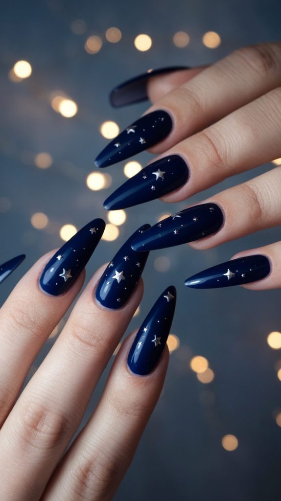 Picture this: a deep navy base with tiny hand-painted stars or silver foils twinkling across your nails. It’s like holding the night sky at your fingertips — literally.