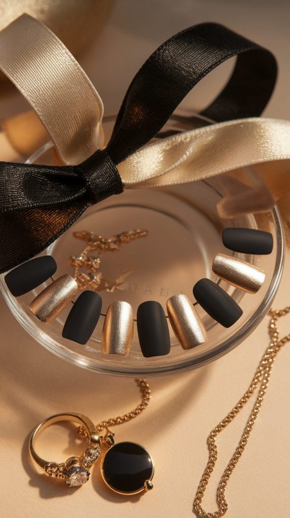 You can go full glam with alternating colors — black on some nails, gold foil on others — or keep it sleek with black nails and thin gold accents.