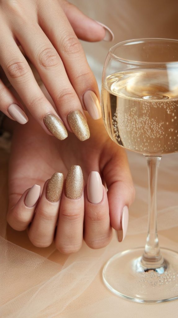 The trick to keeping gold glitter nails classy and not “craft project gone wrong” is balance. Pair a fine gold shimmer polish over a nude or champagne base. This gives your nails depth without going overboard.
