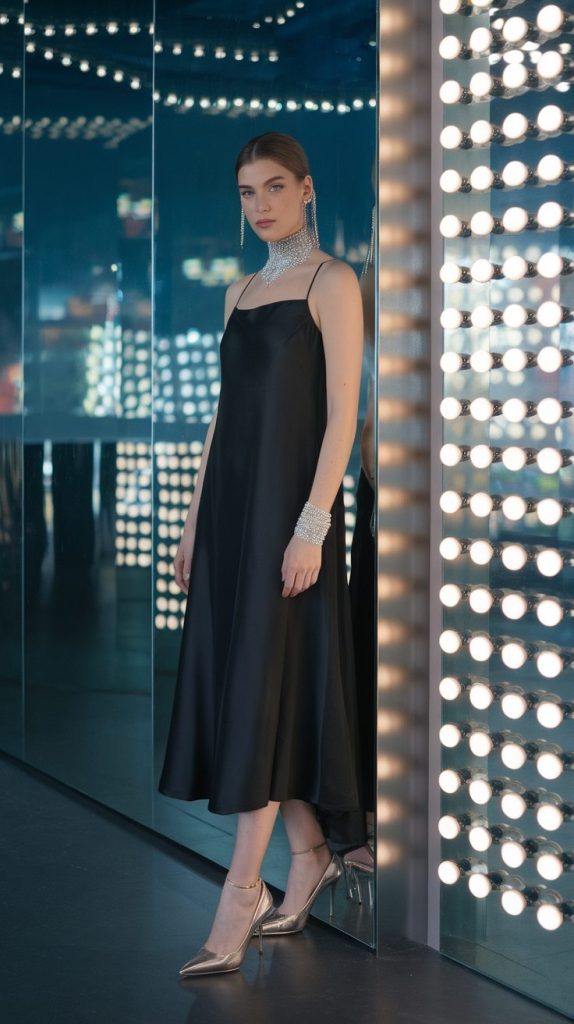 If you’re not into sparkle, satin’s your best friend. It gives off that “I didn’t try hard but still look expensive” energy. A cowl-neck satin midi in champagne, bronze, or black paired with minimalist jewelry and strappy sandals? Chef’s kiss.