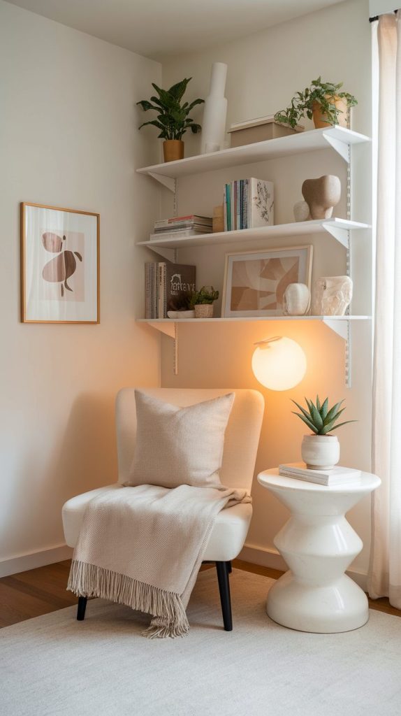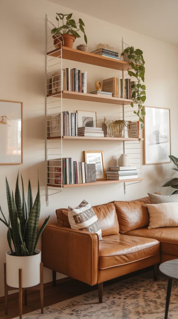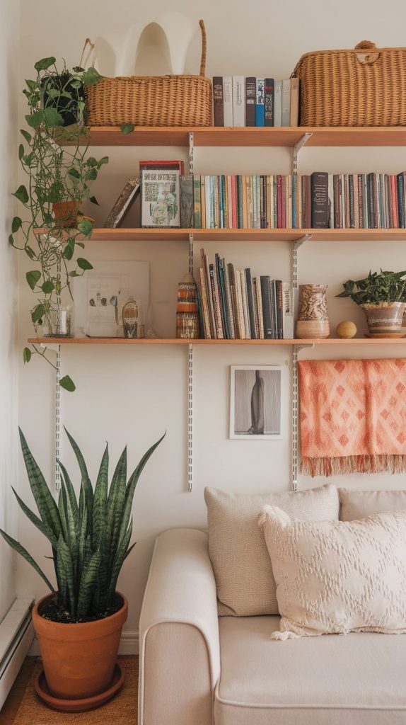 Apartments rarely give us generous floor space, so I always look upward for storage opportunities. Wall-mounted shelves, tall bookcases, and hanging organizers instantly add storage without crowding the room.