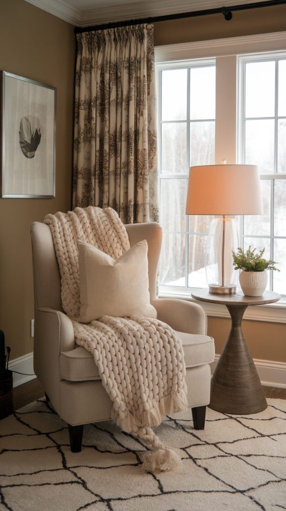 An accent chair with a throw and cushion becomes a winter retreat fast. I have one chair that only gets used once it’s cold outside. Funny how seasons change how we use furniture.