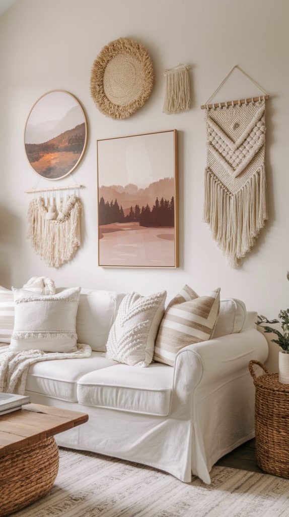 - Textured wall hangings like woven art