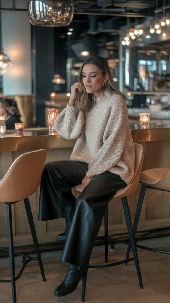 The faux leather pants give you that sleek, edgy vibe, while the oversized sweater softens the look and makes it dinner-appropriate.