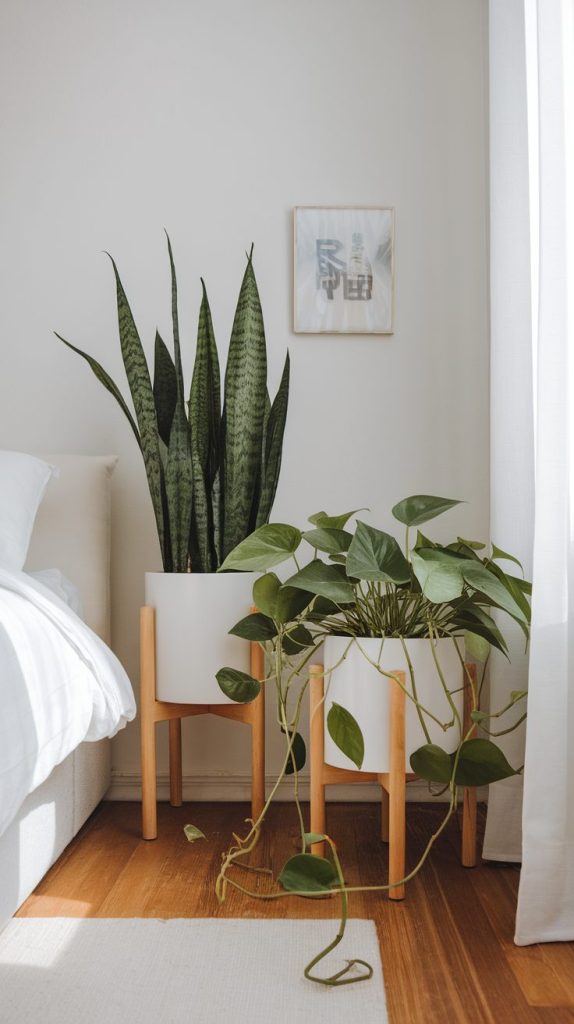 Plants soften a bedroom and improve the overall vibe, even if you barely keep them alive. I stick to low maintenance options because I value sleep more than plant drama.