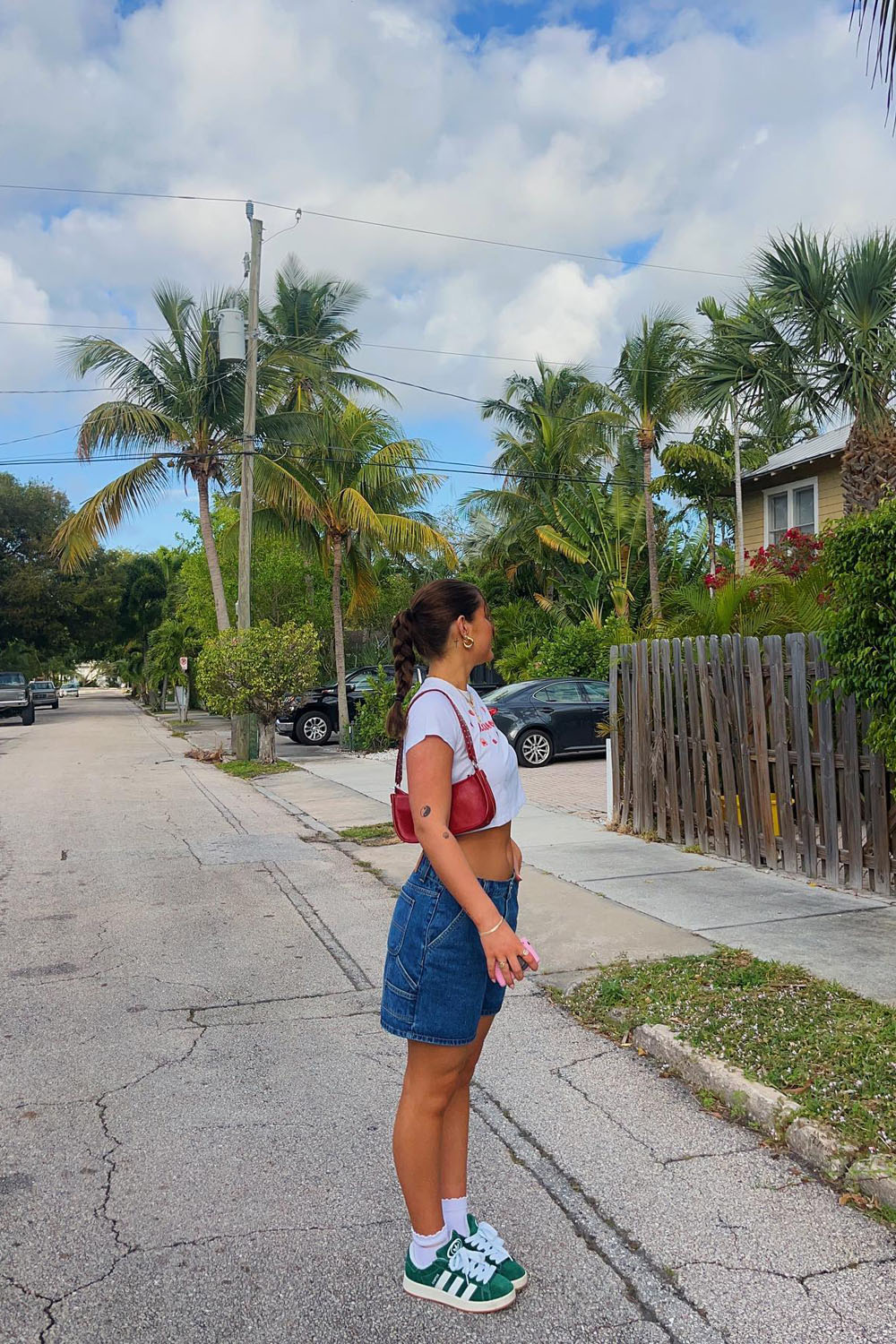 If you love that throwback sporty vibe, this fit is totally IT! The cropped graphic tee and high-waisted denim Bermuda shorts are giving major cool-girl-on-the-go energy. Plus, those green Adidas sneakers? Dead. So cute. So unexpected. So right.