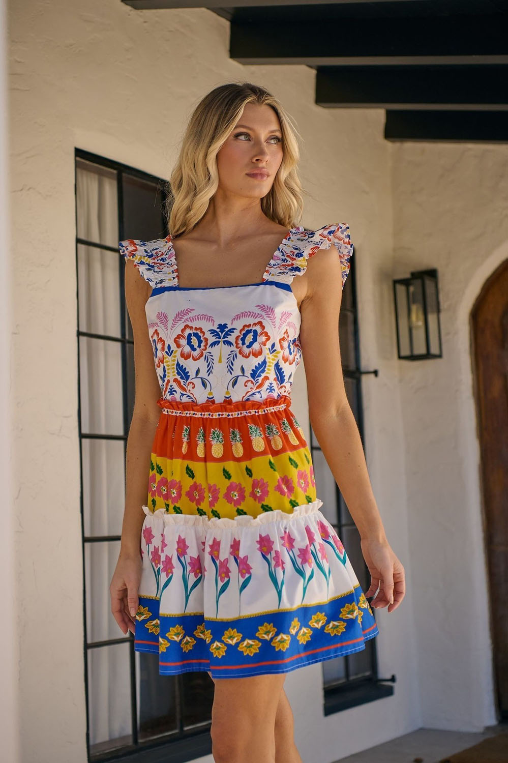 This one’s giving total “life of the party” vibes, and I’m here for it! The moment you slip into this colorful mini dress, you’re instantly radiating main character energy. I mean, those fiery pops of orange, pink, blue, and teal? Literal sunshine bottled into an outfit. And don’t even get me started on the flirty ruffles — they’re made for twirling through summer soirées and brunch dates.