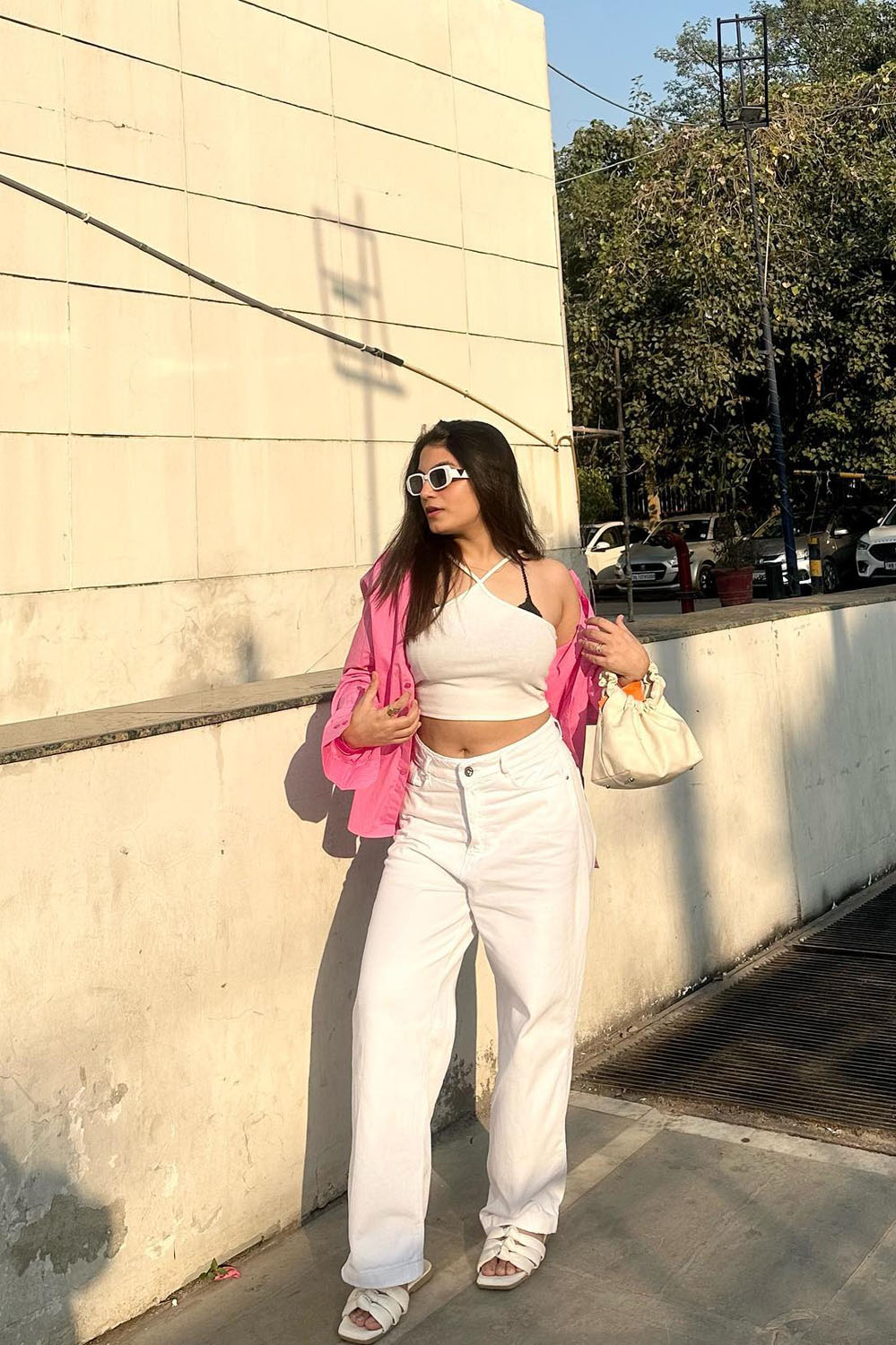 This one’s giving “off-duty model meets city sunshine” and honestly, I’m obsessed. The all-white base — white crop top and baggy jeans — already screams clean and cool, but then boom — that hot pink jacket totally makes the outfit. It’s like you planned a chill day but couldn’t resist adding a little “main character moment” to it.