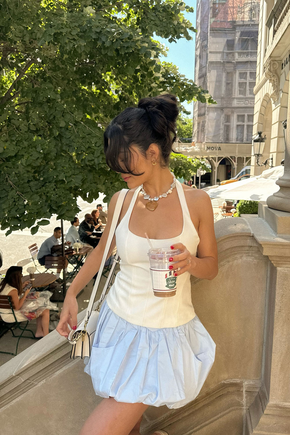 OMG, how dreamy is this little number?! The fitted halter top and pastel blue bubble skirt combo is basically the ultimate summer brunch fit. It’s flirty, fun, and still super comfy — aka, everything we love rolled into one look. And the little structured bag and chunky pearl necklace? YES, girl. YES.