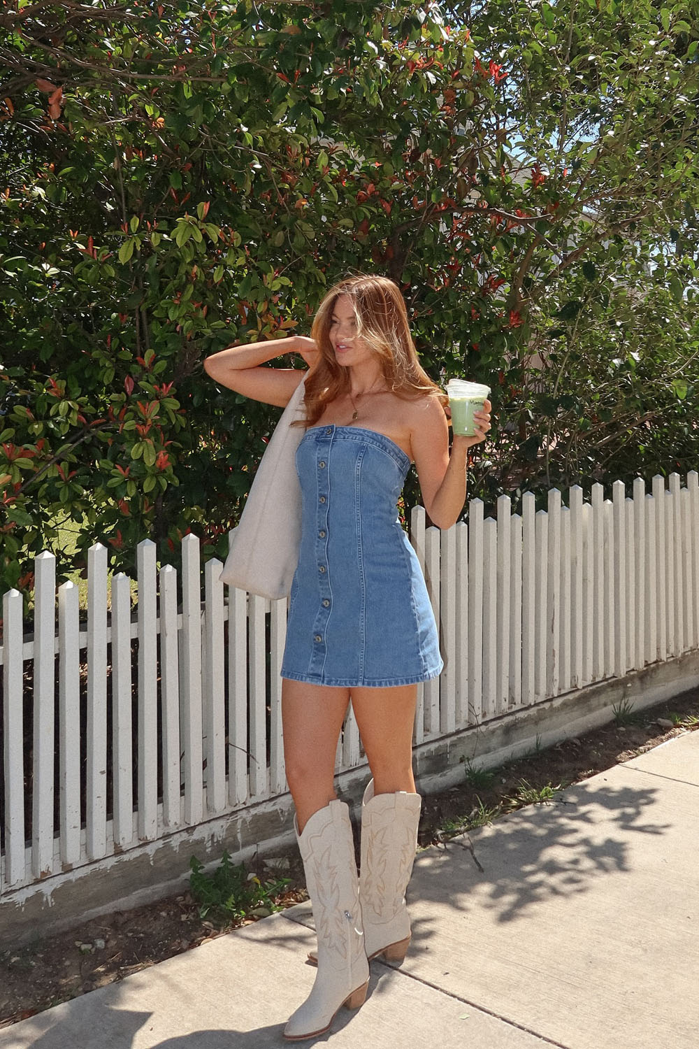 If you’re looking for a way to channel your inner coastal cowgirl this summer, this denim strapless dress paired with creamy cowboy boots is literally the vibe. I’m talking sweet tea in one hand, sunshine on your face, not a single care in the world.