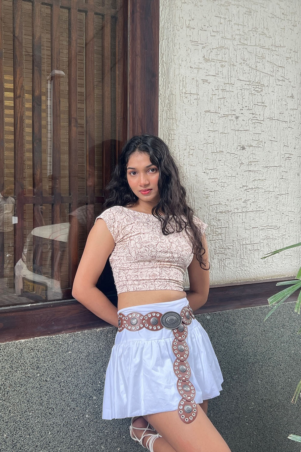 This one’s giving total carefree festival queen energy! The soft blush crop top paired with a white mini skirt is already peak summer cuteness, but that oversized belt? OMG, it takes it to another level. Total vintage, total boho, total moment.