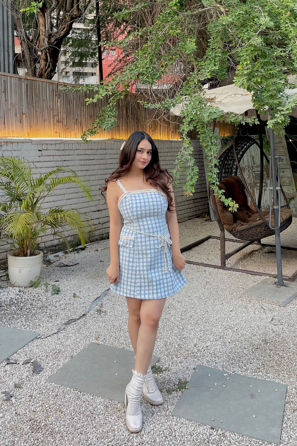 One fab outfit you’ll love is this sweet blue gingham mini dress that looks like it was made for sunny days and iced tea sipping. It’s playful without being too girly — the perfect mix of cottagecore sweetness and cool-girl style.
