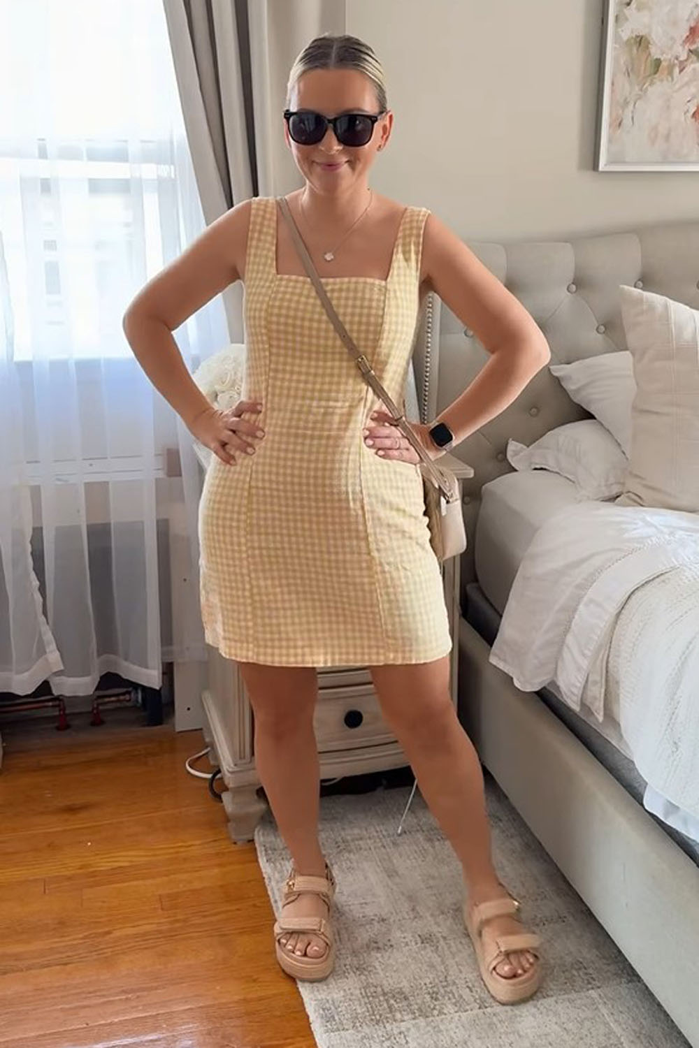 If you ever wanted to literally wear sunshine, THIS is the outfit. This soft yellow gingham mini dress paired with comfy beige sandals is just pure happy energy. I love how it’s simple, breezy, and totally effortless — but still looks super put together.