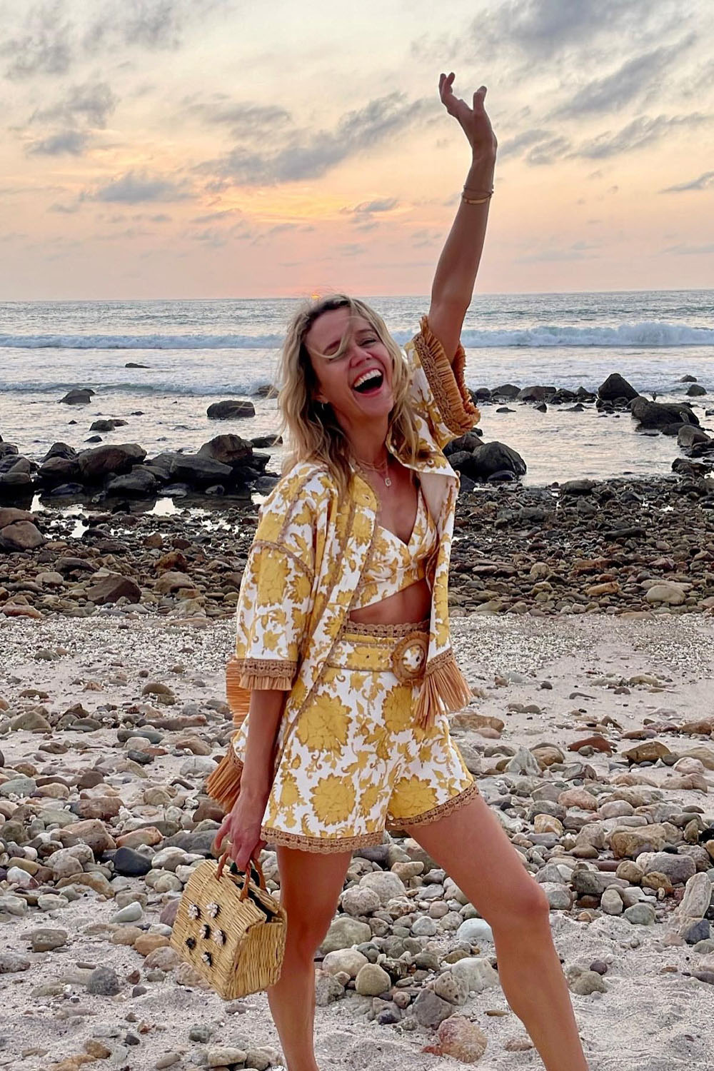 This one’s an instant mood-booster! The yellow-and-white floral printed set — flowy shorts, matching bralette, and relaxed shirt — is literal sunshine in outfit form. Plus, that woven handbag? Such a cute nod to beachy boho style without feeling too over-the-top.