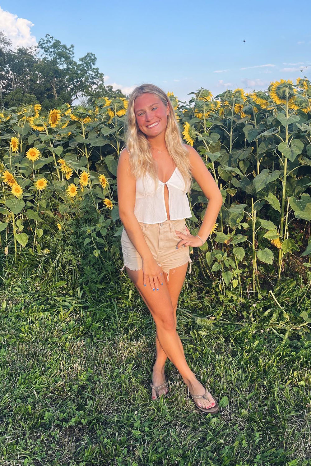 One fab outfit you’ll love is this easy, breezy sunflower-field-ready fit! A crisp white knotted crop top with soft beige shorts feels SO fresh and summery without trying too hard. It’s giving golden hour energy, bare feet in the grass, and pure joy.