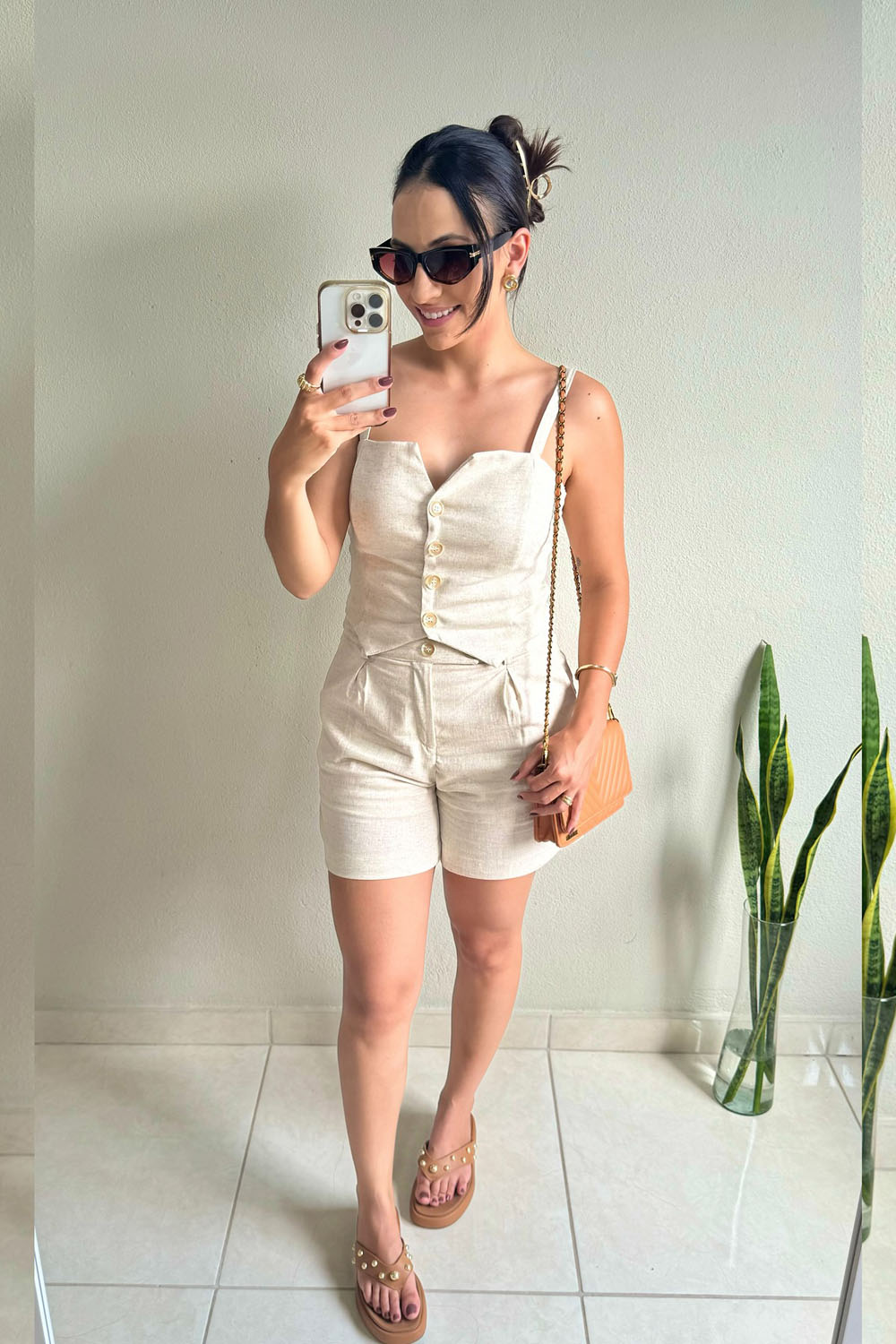 If you love a good neutral vibe, this outfit is basically your new summer BFF. The sleeveless beige romper with button details and a waist tie is SO effortlessly stylish. It’s giving easy-breezy and polished all at once, without even trying.