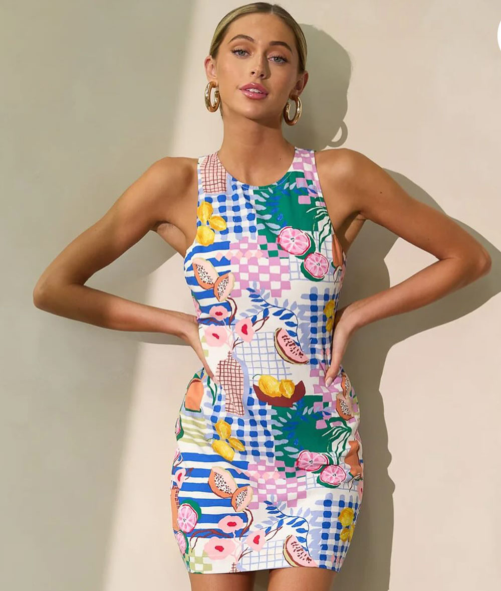 OMG, how fun is this colorful printed mini dress?! It’s literally impossible to be in a bad mood while wearing something this cute. The bold tropical fruit print mixed with the gingham patterns is such a playful mash-up — it’s giving “vacation mood activated” in the best way.