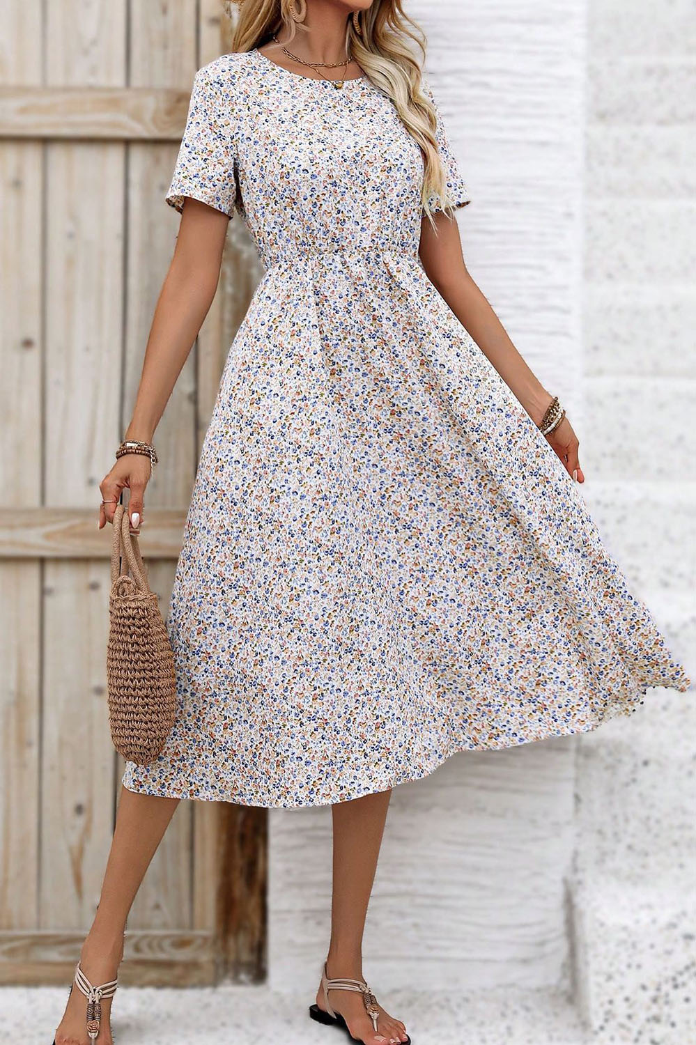 If you’re dreaming of twirling through cobblestone streets with an iced latte in hand, this floral midi dress is basically your summer soulmate. The flowy fabric, the tiny floral print, the soft waist gathering — it’s all giving breezy romance with zero effort.