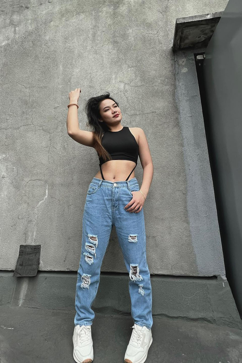This one’s giving total “effortlessly cool street style” vibes! The strappy black crop top paired with distressed boyfriend jeans and chunky white sneakers is such a LOOK. It’s casual but make it fashion.